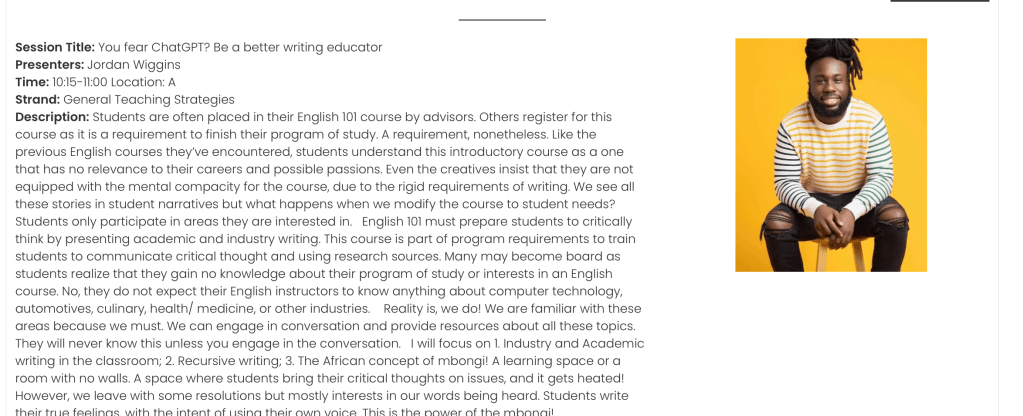 Description: Students are often placed in their English 101 course by advisors. Others register for this course as it is a requirement to finish their program of study. A requirement, nonetheless. Like the previous English courses they’ve encountered, students understand this introductory class as a one that has no relevance to their careers and possible passions. Even the creatives insist that they’re not equipped with the mental capacity for the course, due to the rigid requirements of writing. We see all these stories in student narratives but what happens when we modify the course to student needs? Students only participate in topics they are interested in. English 101 must prepare students to critically think by presenting academic and industry writing. This course is part of program requirements to train students to communicate critical thought and using research sources. Students may become bored when they realize that they gain no knowledge about their program of study or interests in an English course. No, they do not expect their English instructors to know anything about computer technology, automotives, culinary, health/ medicine, or other industries. Reality is, we do! We are familiar with these areas because we must. We can engage in conversation and provide resources about all these topics. They will never know this unless you engage in the conversation. I will focus on 1. Industry and Academic writing in the classroom; 2. Recursive writing; 3. The African concept of mbongi! A learning space or a room with no walls. A space where students bring their critical thoughts on issues, and it gets heated! However, we leave with some resolutions but mostly interests in our words being heard. Students write their true feelings, with the intent of using their own voice. This is the power of the mbongi!