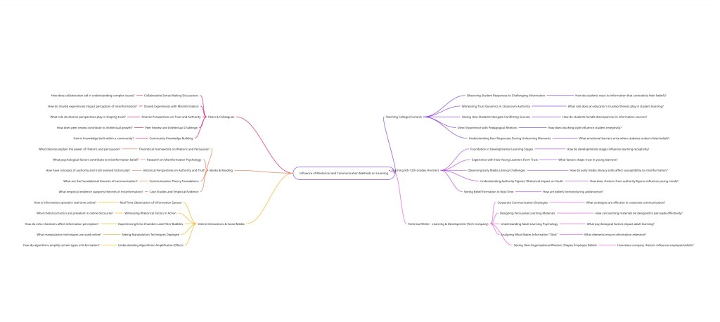 Overall question: How do rhetorical and communication methods—particularly those used by trusted individuals and amplified through social media—shape what learners are willing to learn or unlearn, influence their susceptibility to mis/dis/mal-information, and affect their emotional and intellectual responses when confronting or dismantling false beliefs about authority and truth?
